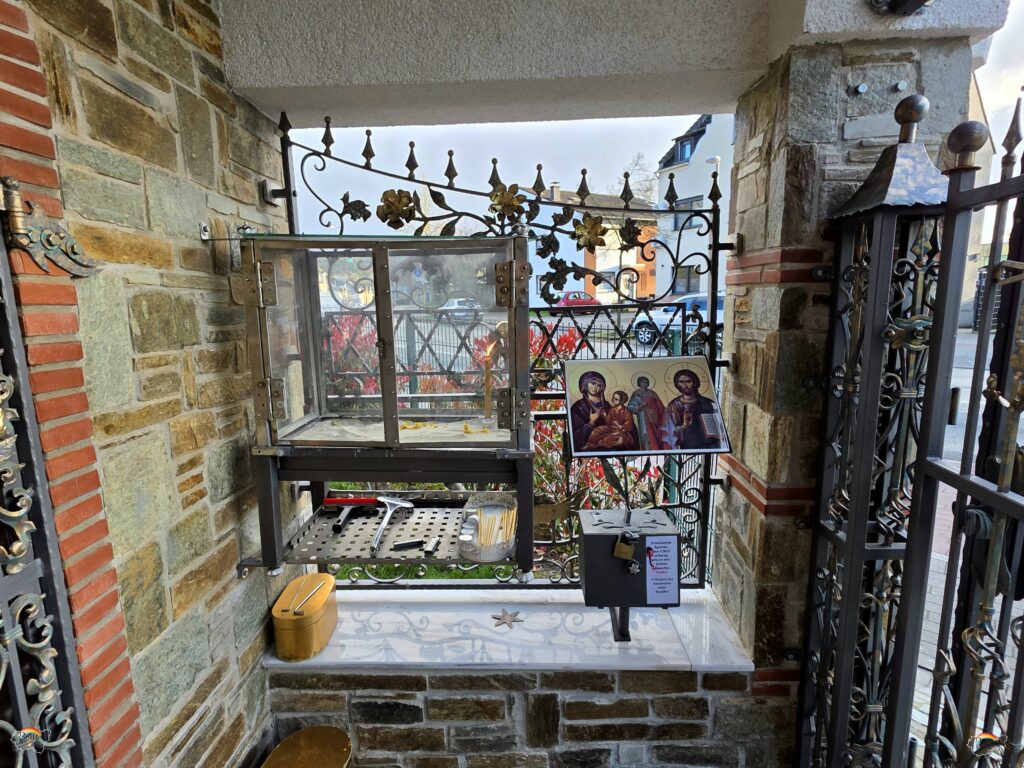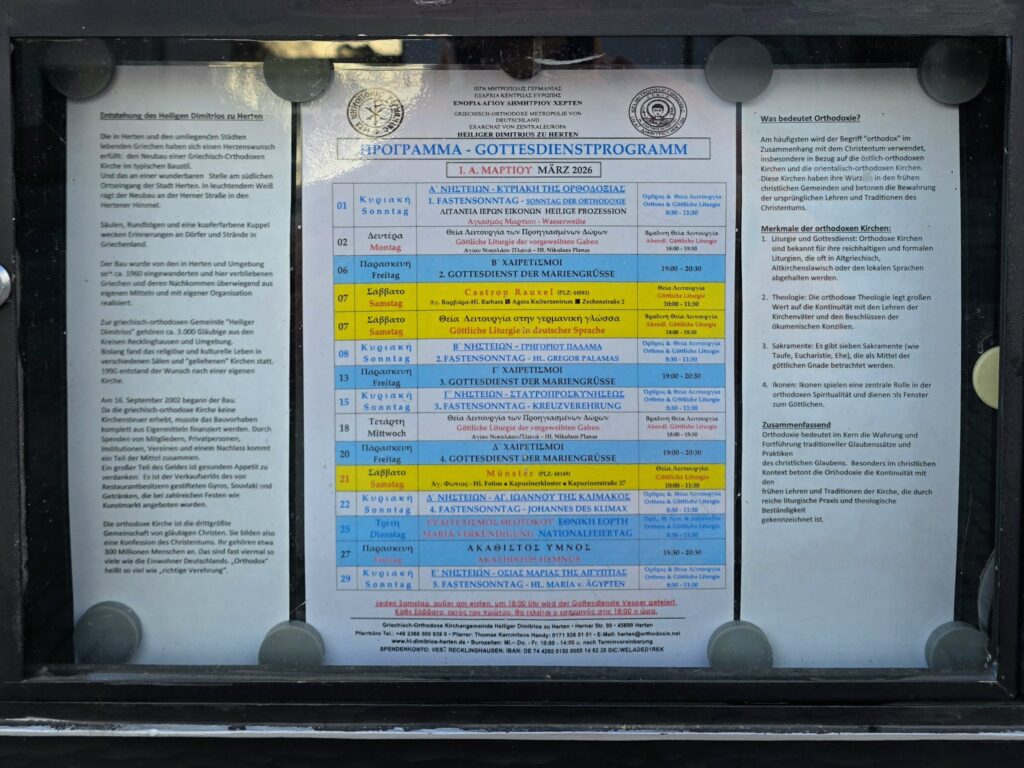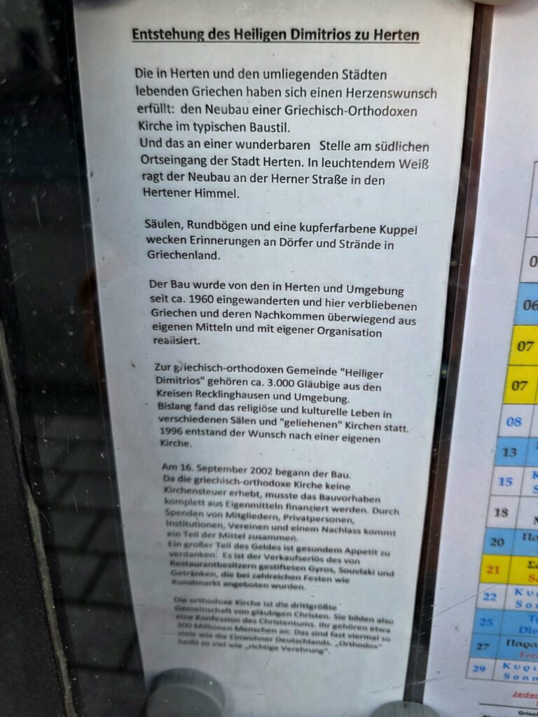 Der Schaukasten erzählt davon, dass der Bau überwiegend mit eigenen Mitteln und in eigener Organisation verwirklicht wurde. Weil die griechisch-orthodoxe Kirche keine Kirchensteuer erhebt, musste vieles über Spenden, Unterstützung aus der Gemeinschaft und viel persönliches Engagement finanziert werden. Da steckt auch ein Stück Ruhrgebietsmentalität drin: Man wartet nicht nur, man packt an. Selbst der Verkauf von Speisen und Getränken bei Gemeindefesten half dabei, die Finanzierung auf die Beine zu stellen.
