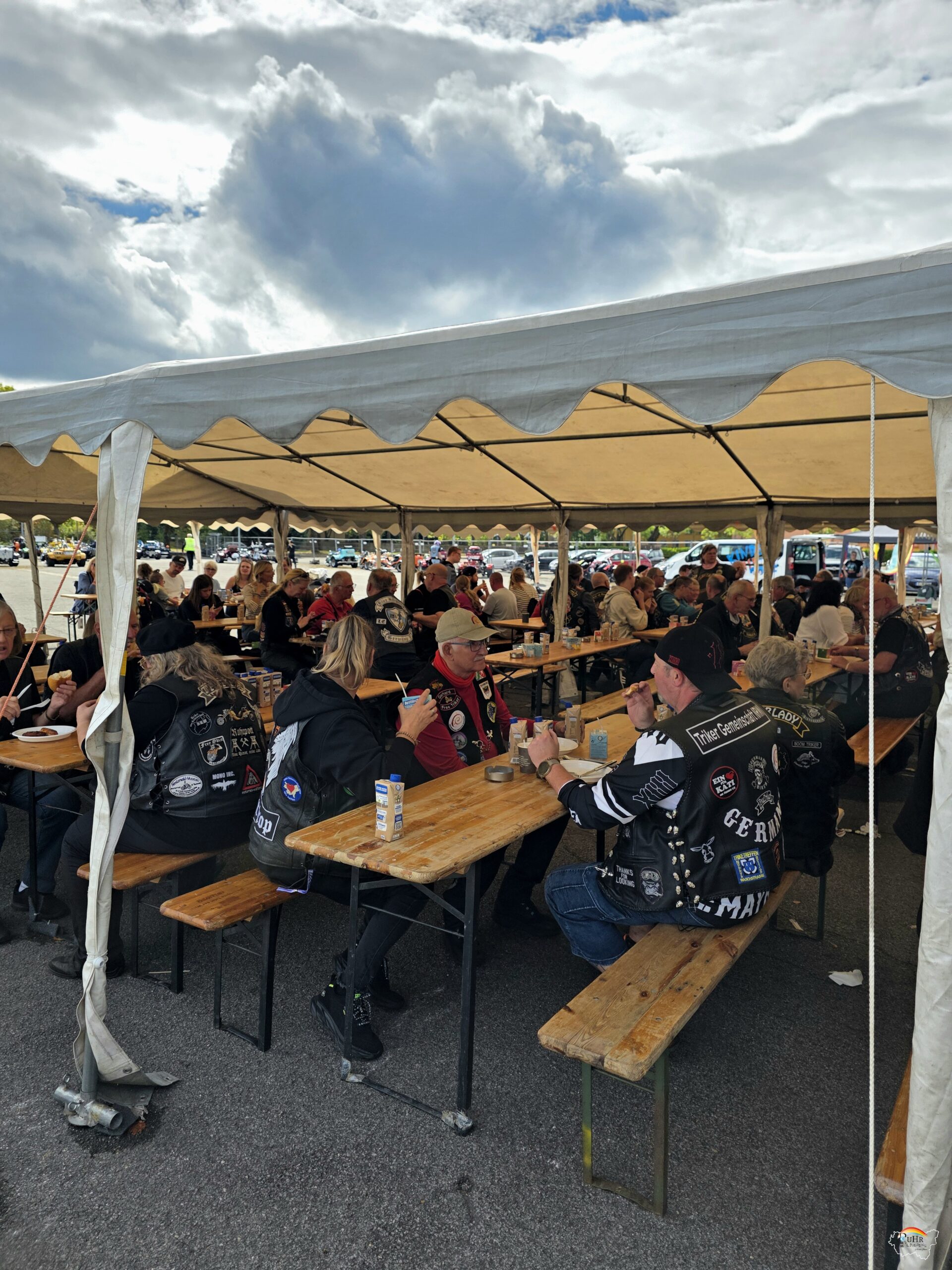 Für die Triker, Kinder und Eltern wurde als Höhepunkt nach 70 Minuten Ausflugsfahrt neben Eis, auch natürlich Salate und Gegrilltes angeboten, die sie unter einem Zeltdach gemeinsam verspeist werden konnten bei netten Gesprächen über die Motorradtechnik und die Kinder.