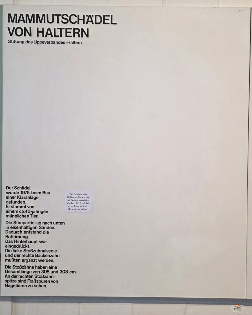 Der Mammutschädel ist bei Ausgrabungen für eine Kläranlage in Haltern 1975 gefunden worden. Er ist im Josef-Albers-Museum Quadrat in Bottrop zu besichtigen. Zur Zeit ist er seit April 2026 verliehen worden ans Ruhrmuseum nach Essen für eine besondere Sonderausstellung: Überleben in der Eiszeit vom 20. April 2026 bis zum 10. Januar 2027.