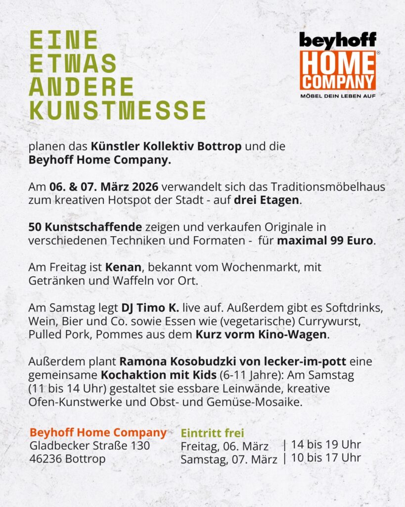 Die führenden Köpfe Ralf Opiol und Nolin Wischermann vom Künstler Kollektiv Bottrop, dem ich auch vor einigen Jahren beigetreten bin, haben sich ein besonderes Event ausgedacht. In der Stadt gab es noch nie eine Kunstmesse in irgendwelchen Ausstellungshallen. Warum sie nicht zwischen Küchen und Wohnzimmereinrichtungen einbauen? Das ist tatsächlich am Wochenende in Bottrop zu besuchen! Und ich bin dabei.